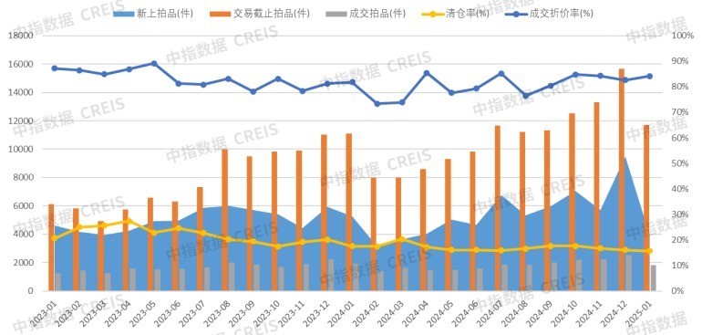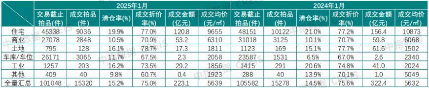 同时,2025年1月法拍房源交易截止累计拍次10.8万次,成交1.5万次,法拍按拍次成交率14.2%,各类拍品成交折价率75%;较2024年1月法拍房源累计拍次11.3万减少约4.8%,较成交1.5万次增加约0.2%。2025年首月各类拍品成交平均拍1.91次,平均成交时长约75天。