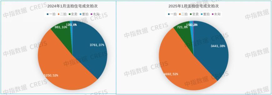 2025年1月法拍住宅在各拍次中一拍成交3441套,各拍次中占比38.1%,较上一年同期增加约1个百分点。二拍成交4692套,各拍次中占比51.9%,较2024年同期增加约0.1个百分点。变卖成交约721套,占比8.0%。重新挂拍及其他情况成交约182套,占比2.0%。